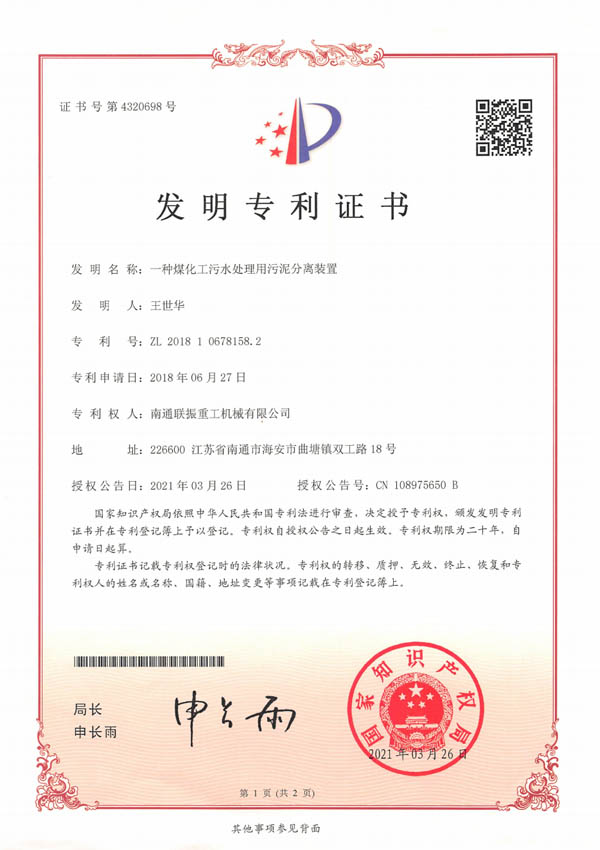 百葉板式振動輸送干燥冷卻機專利證書