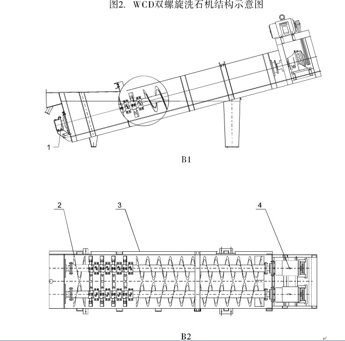 螺旋洗石機由槽體、減速機、電機、中心軸、螺旋葉片、支架組成。支架焊接在中心軸上,螺旋葉片裝好后用螺栓壓緊,使葉片不下垂不變形。